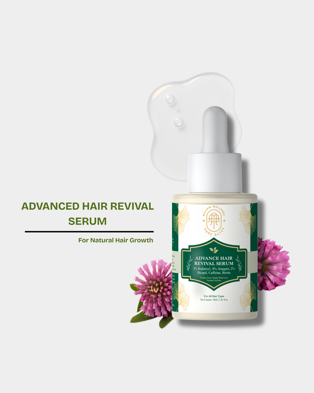 Willow Wellness Advanced Hair Revival Serum - 30ml | Powerful Hair Growth Formula with 3% Redensyl, 4% Anagain, 2% Baicapil, Caffeine & Biotin. | Clinically Proven Hair Growth Formula. Boost Hair Growth & Reduce Hair Fall...Sale price Rs. 499.00Regular price Rs. 999.00 -