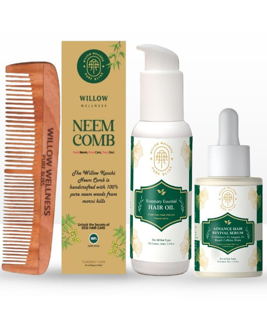 Willow Wellness Hair Revival Combo | Hair Growth Serum + Rosemary Oil + Neem Wooden Comb | Anti Hair Fall & Scalp Care Kit