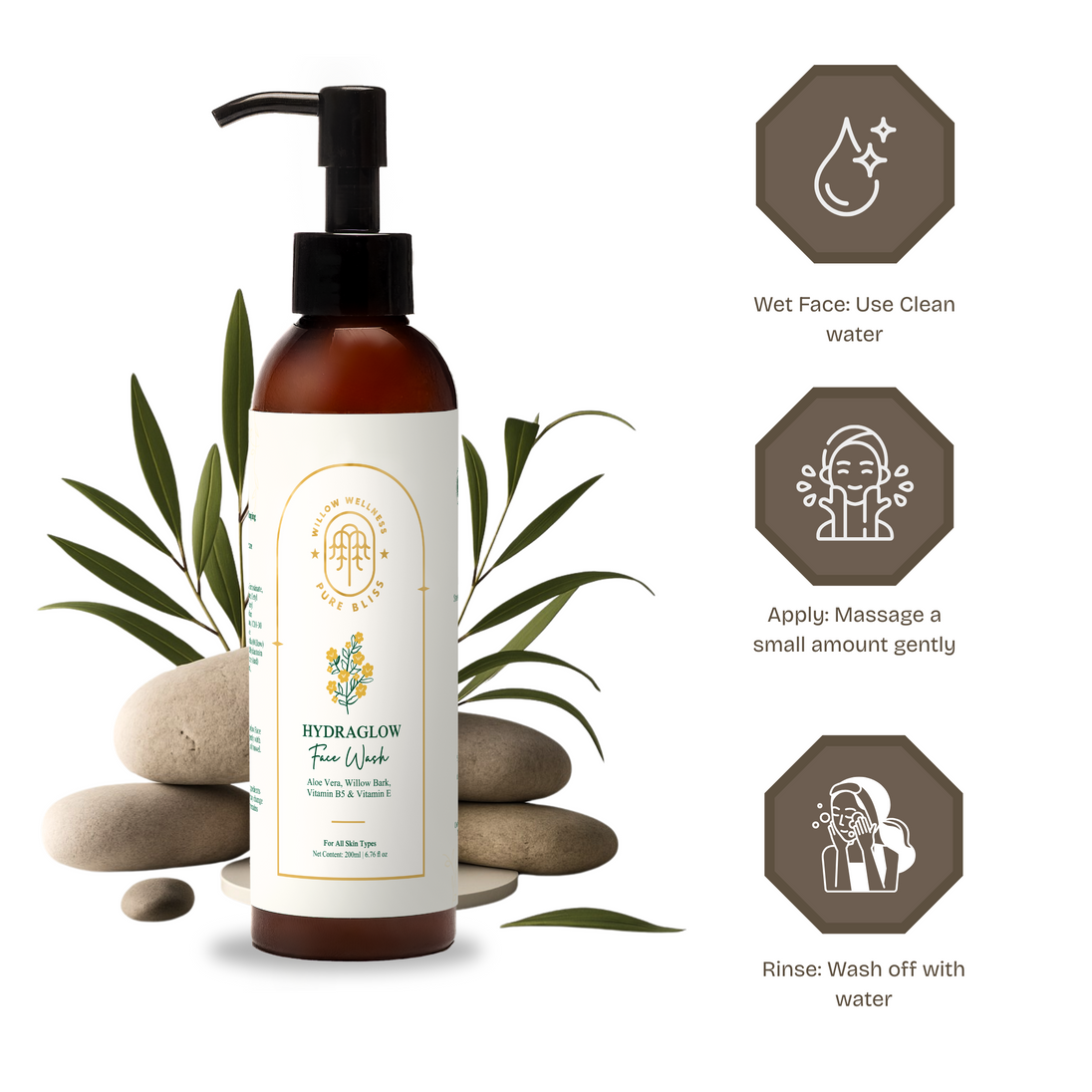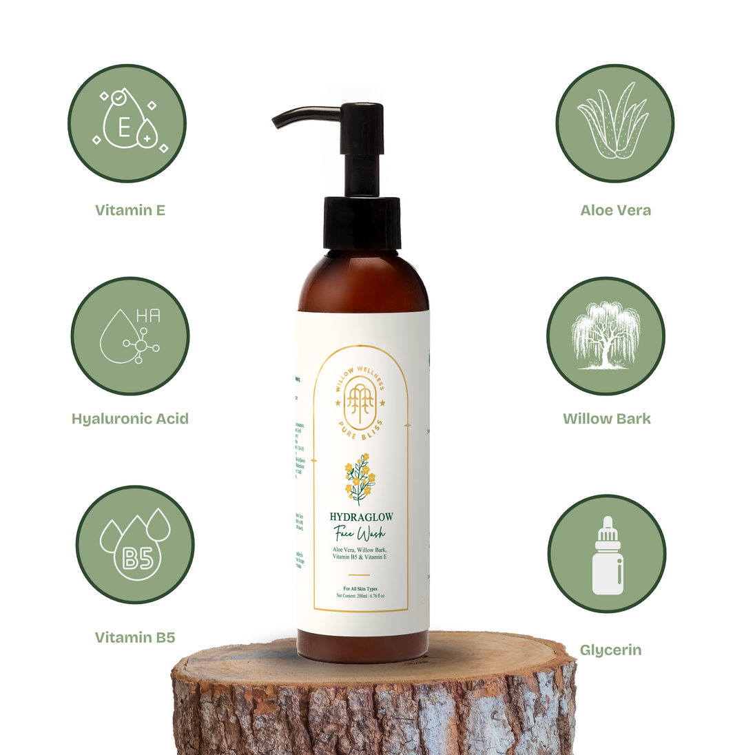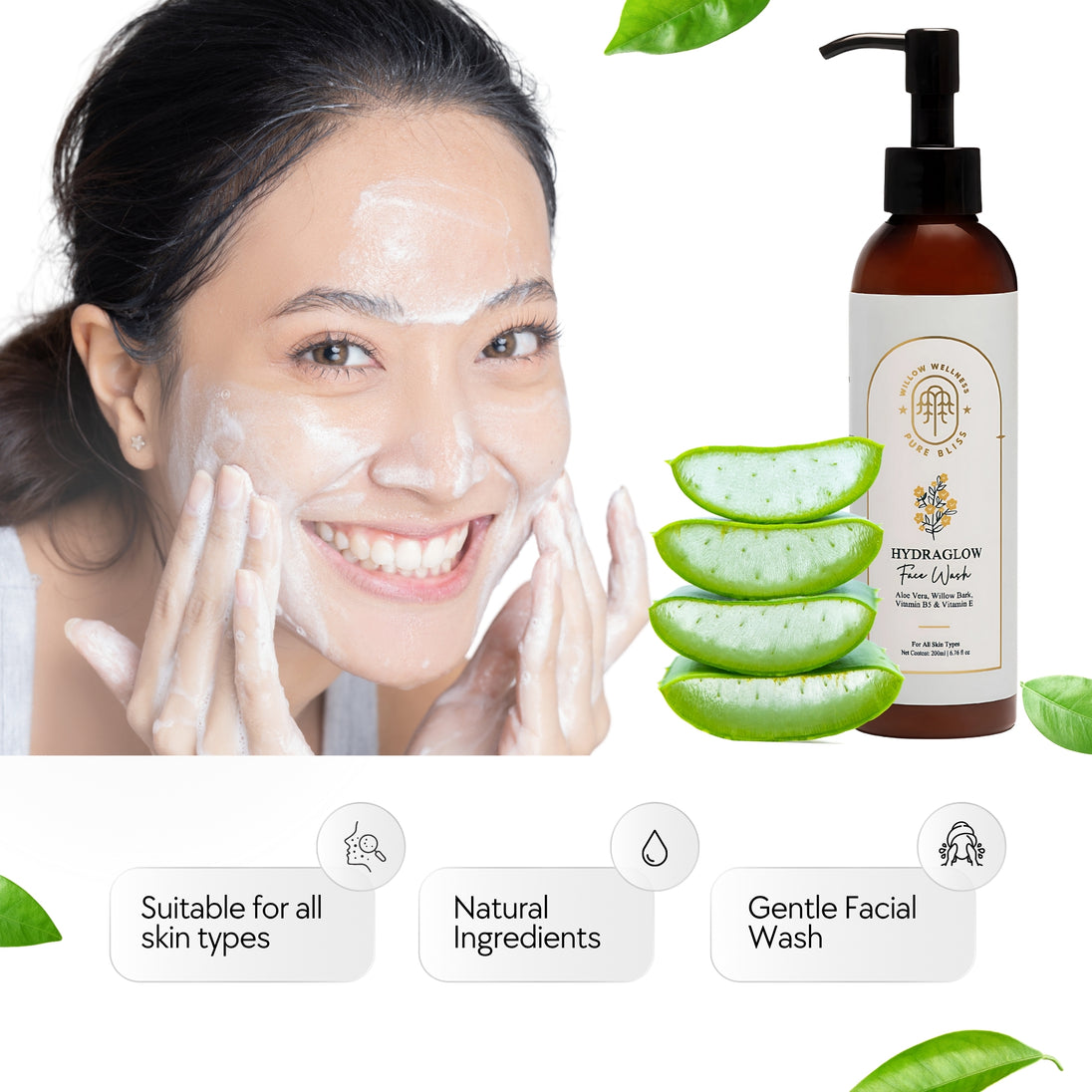 Transform your skincare routine with the Willow Wellness Hydraglow Aloe Vera Face Wash. This gentle yet effective cleanser is enriched with Hyaluronic Acid, Aloe Vera, Willow Bark Extract, Vitamin B5, and Vitamin E to deliver a refreshing, hydrating cleanse without stripping your skin of essential moisture. Designed for all skin types, this paraben- and sulphate-free formula deeply cleanses pores, reduces acne, and restores your skin’s natural glow.